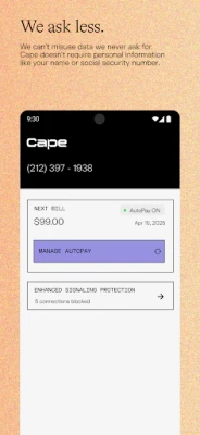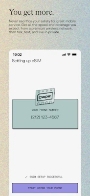 Privacy-First Approach: At Cape, we believe that your data belongs to you, and only you. Cape will never sell your data. In fact, we only ask for the bare minimum required to provide you with high-quality cell service. Unlike other carriers, we don’t need extensive personal information to deliver exceptional service.