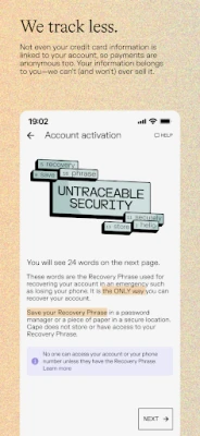 • Anonymous Sign-Up: At Cape, we ask less. Cape only requests the minimum amount of personal information needed to provide you with exceptional service, and we will never sell your data. Your identity is your business, not ours.