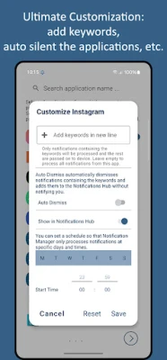 • Auto Dismiss: This prevents you from getting distracted every time you receive a new notification by silently dismissing notifications containing certain keywords from certain apps within the defined schedule. Notification Manager stores them in the Notification Hub so you can view them when free.
